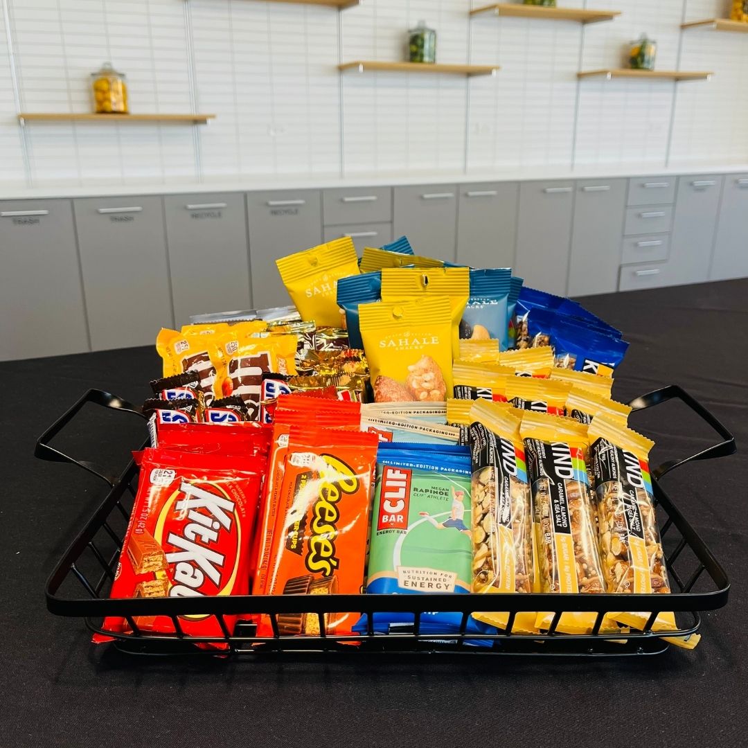 Assortment of snack mixes, nuts, candy bars, protein bars, cookies, popcorn, chips